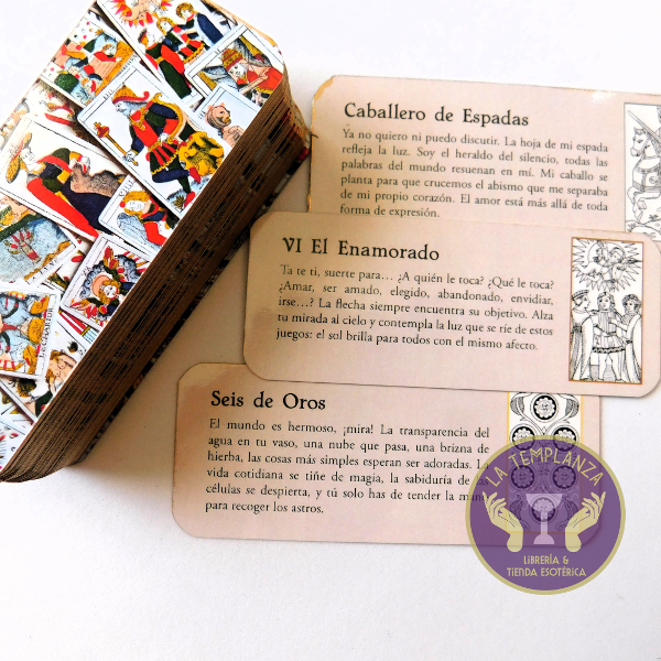 Cajita con 78 cartas en una edicion deluxe, con bordes dorados. Cada carta contiene su mensaje oracular.